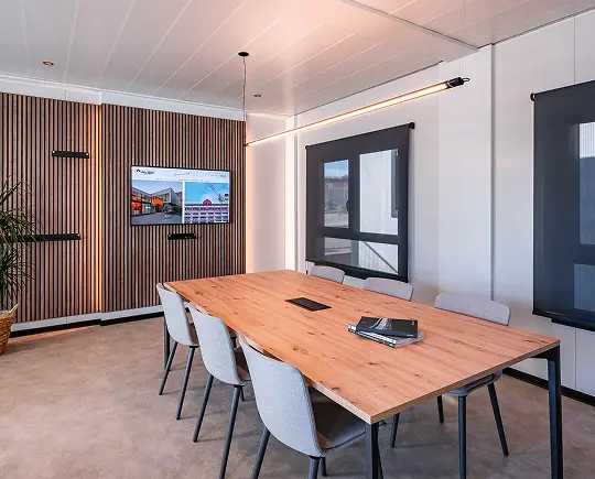 Gracias a materiales de alto nivel, incorporan aislamiento térmico y acústico avanzado, con cubierta de lana de roca, fachadas en PIR y techos fonoabsorbentes.