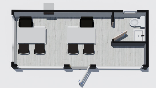 Esta sala de venta u oficina modular esta especialmente diseñada para la atención de público. Cuenta con baño prefabricado. Es altamente solicitado por inmobiliarias y automotoras. Combinable con otros módulos.